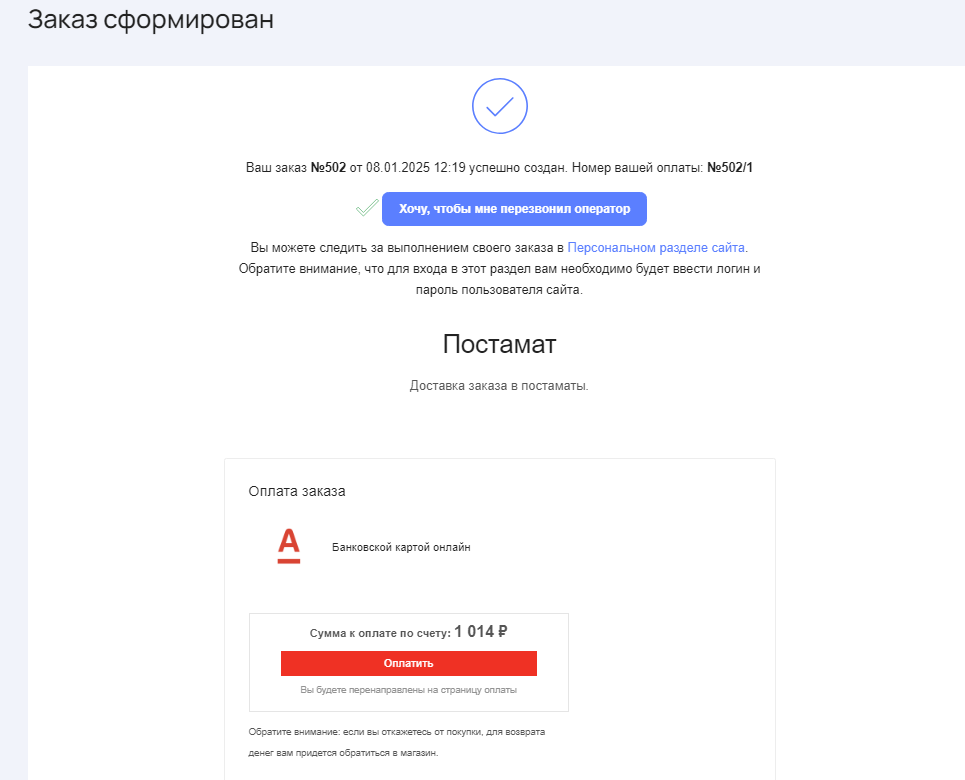Если Вам необходимо, чтобы оператор связался с Вами после оформления заказа выберите «Хочу, чтобы мне перезвонил оператор». После чего на экране отобразиться номер Вашего заказа, а также Вы получите смс-уведомление с номером заказа. По этому номеру можно отследить статус заказа в Личном кабинете, если Вы зарегистрированы на сайте.
